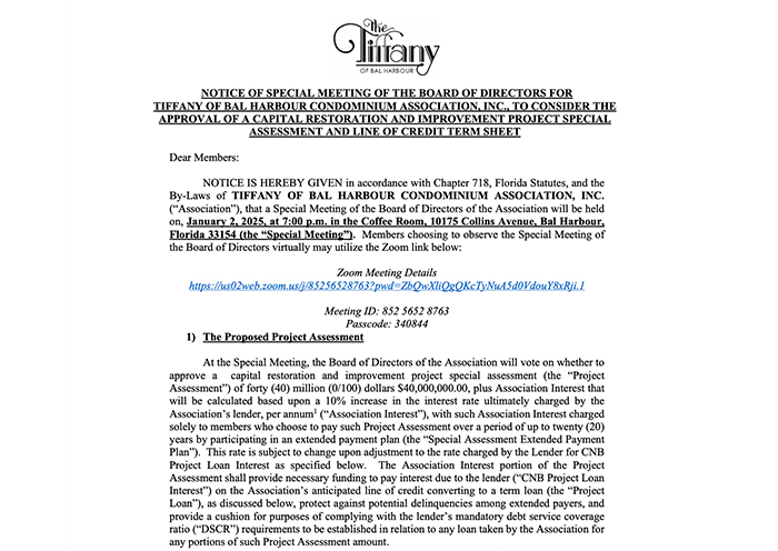 Ideally located on the oceanfront in the prestigious Bal Harbour community, The Tiffany offers a refined coastal lifestyle with full-service amenities designed for comfort, wellness, and relaxation. This elegant condominium provides residents with a serene beachfront setting combined with attentive services and thoughtfully designed common areas.
